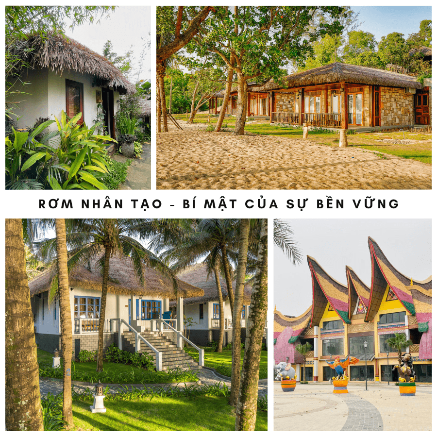 Khác với rơm tự nhiên – dễ mục nát, dễ cháy và cần bảo trì thường xuyên, rơm nhựa mang đến một giải pháp bền vững cho những công trình yêu cầu yếu tố thẩm mỹ lâu dài và an toàn. Đặc biệt, rơm nhân tạo ngày nay được sản xuất bằng công nghệ chống cháy, chống tia UV, không ẩm mốc, có thể chống chọi với mọi kiểu thời tiết – từ nắng gắt miền Trung đến độ ẩm cao ven biển phía Nam.