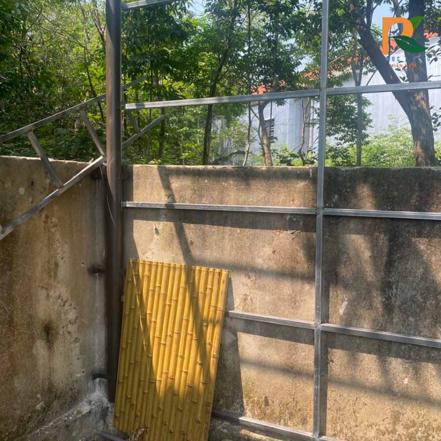 👉 Đây là bước quan trọng, vì khung thép đóng vai trò “xương sống” cho toàn bộ vách tre.