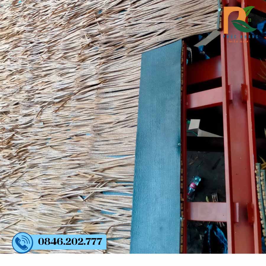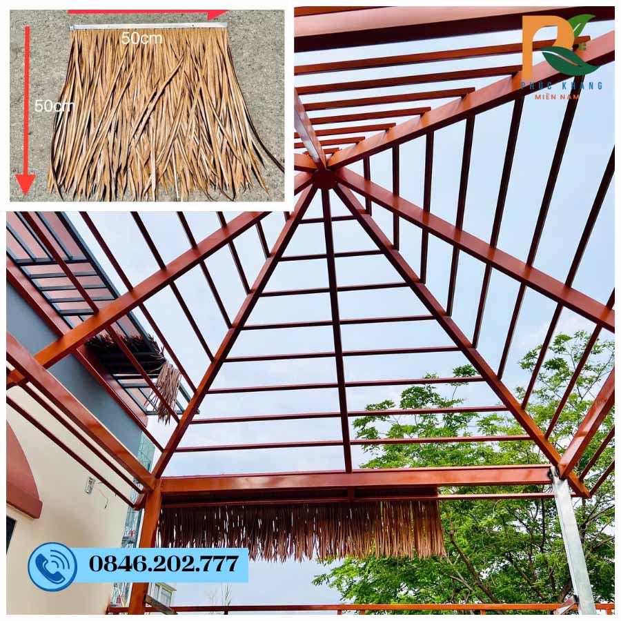 Với mật độ 12 tấm/m², mái chòi có độ phủ đều, không lộ khung, đồng thời tối ưu chi phí cho chủ đầu tư.