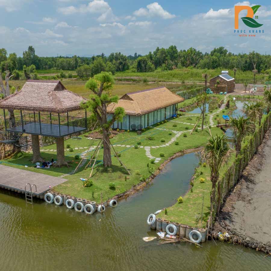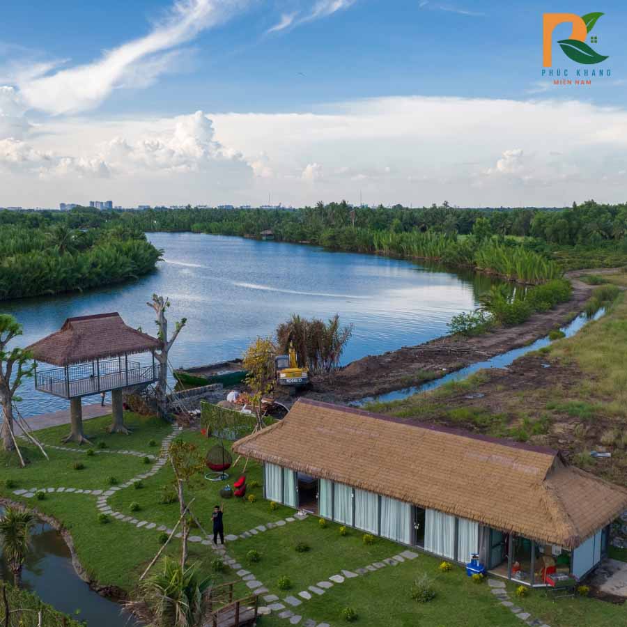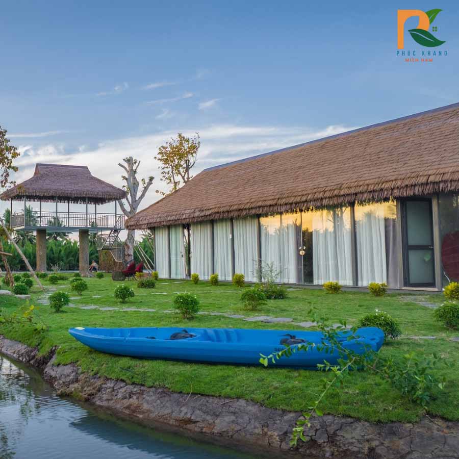 Tọa lạc ven sông với khung cảnh xanh mát, nơi đây mang phong cách glamping – cắm trại sang trọng, vừa hiện đại vừa giữ được vẻ đẹp mộc mạc của miền quê sông nước Nam Bộ.