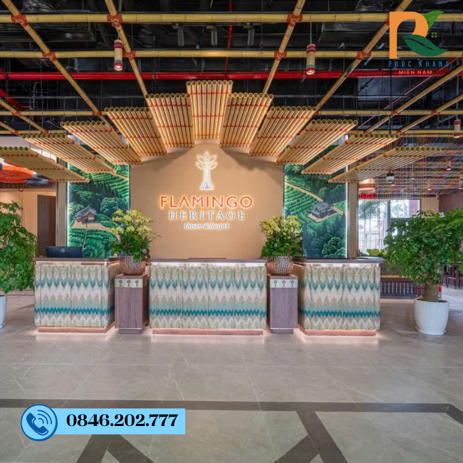 Flamingo Tân Trào là một trong những khu nghỉ dưỡng cao cấp nổi bật giữa không gian núi rừng Tuyên Quang, nơi du khách có thể tìm về với thiên nhiên và tận hưởng sự yên bình. Trong dự án này, Phúc Khang Miền Nam tự hào là đơn vị cung cấp và thi công rơm nhân tạo và tre nhân tạo, mang đến giải pháp trang trí bền vững, thân thiện môi trường và có tính thẩm mỹ cao.
