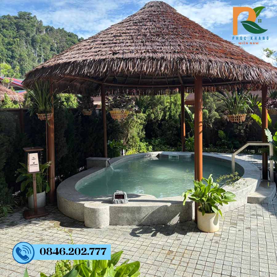 Khu vực hồ thư giãn ngoài trời của Flamingo Tân Trào sử dụng rơm nhân tạo màu nâu xám do Phúc Khang Miền Nam cung cấp và thi công. Loại rơm này được lựa chọn kỹ lưỡng nhằm đảm bảo yếu tố thẩm mỹ, độ bền và khả năng chống chịu thời tiết.