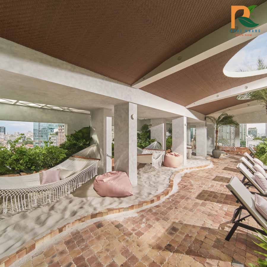 - Khu nghỉ thư giãn với võng treo, ghế lười.