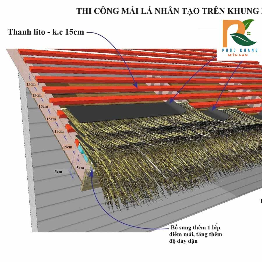 Lơp rơm nhân tạo trên mái phụ khoách cách từ 20-30cm tùy mật độ